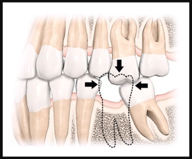 The diagram on the right shows what happens if a missing first molar isn’t replaced. The tooth in front of it will tend to tip backward a little, creating a gap between it and the tooth in front of that. The tooth behind will tip forward, usually quite a bit, trying to close that space. The tooth above will super-erupt. This causes three problems. One is that the teeth that are tipping will be weakened. They are now subject to stresses they aren’t designed to withstand, which may lead to eventually losing those teeth also. Second, they create food traps that can be difficult to clean, leading to gum disease. But the most serious problem is that they will disrupt your otherwise harmonious bite, which can lead to muscle spasms and TMJ disorder.